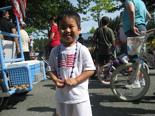 Our neighborhood had a little parade this morning to celebrate the 4th. El went down for a nap and I took Evan to take part in his first parade. Here he is in his gear, ready to scoot in the parade.